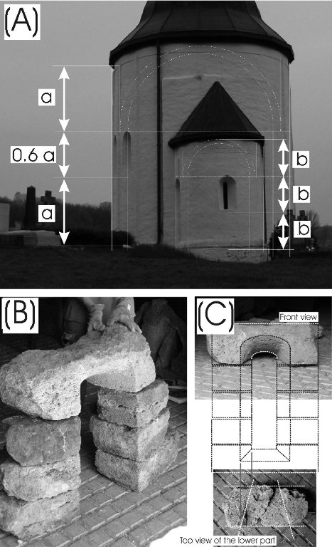 The size of the windows was an important factor in determining the height of the church. From the burial ground around the church, tombstones, tomb cover stones and various other carved stones were recovered. Fragments of the windowsill were also recovered, and from its reconstruction the width of the window was determined. The angle between the inwards narrowing sidewalls of the window and the tangent of the curved external wall gave some idea for the identification of the side border stones of the windows. Because of the size of the stones and their similar shape it was possible to calculate the exact dimensions of the windows. The ratio between the windows’ widths and heights mostly fell between certain limits. One stone less would have resulted in a too short window, whilst a stone too many would ended up with one of excess height. We managed to find the top arched stone of the window, which fitted exactly to the side stones underneath (See Figure 4).