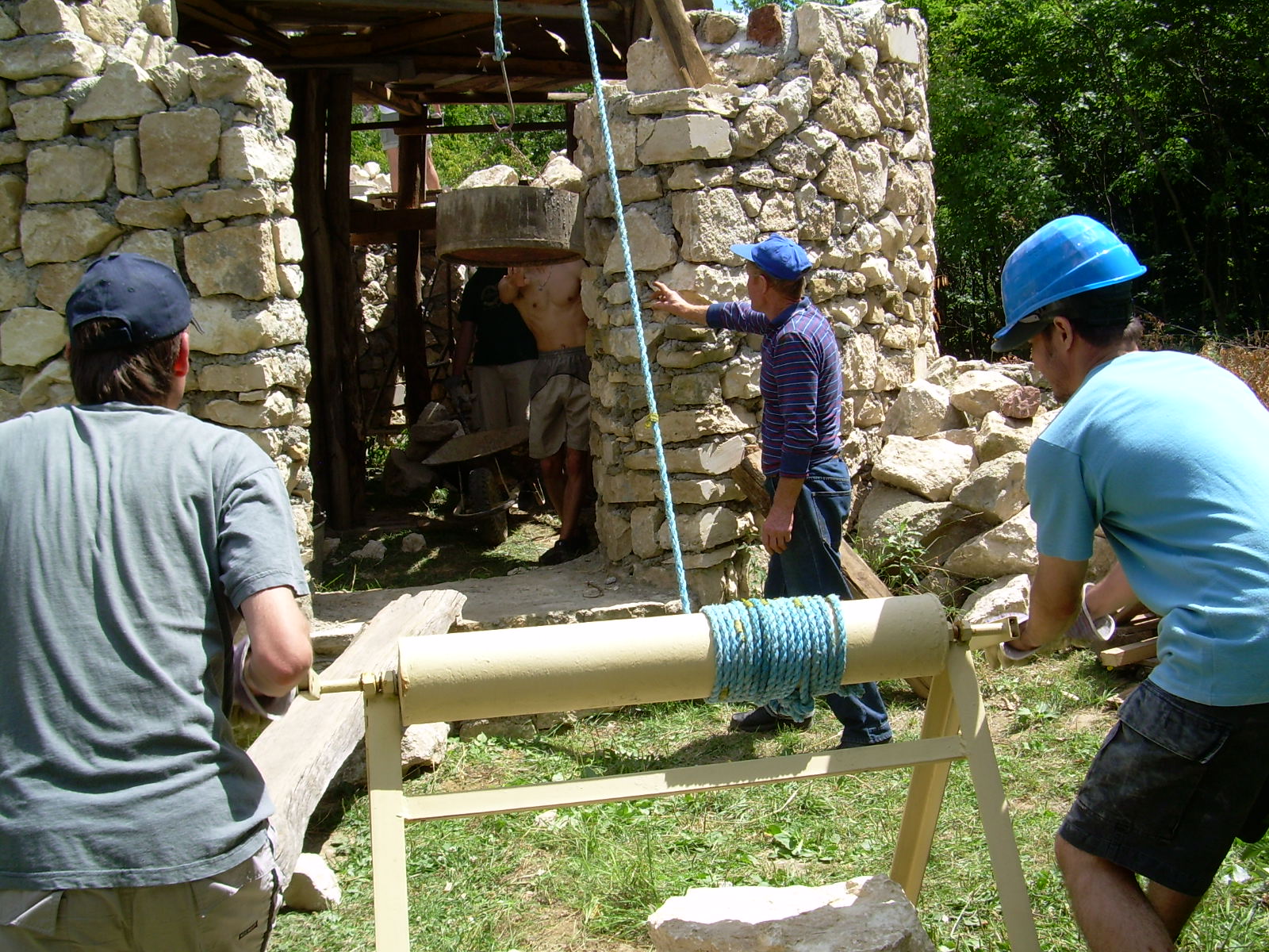 The strong and stable scaffolding, built of logs, serves as storage for the hoisted up stones (See Figure 15, below in the Image Gallery). The hexagonal scaffold arrangement suits the round building well. Above the entrance a 60 degree segment is left open. This is the logical location for the tripod with the pulley, serving as a hoist for lifting the large and heavy stones. The operating rope goes outside, above the entrance, to the winch located in the front of the building. With the increased height of the wall an opening has to be left for the rope. On the front of the medieval churches one can often find a small window or a round opening above the entrance. That could have served this purpose in this technology. Of course, after the church was finished the opening could have been walled in, or the rope could have been lead in a different way. In one week we managed to build about 1- 1.5 m high wall. We concluded from this that, within one building season (from spring to autumn), a village church could have been built by a master builder with the whole village giving a helping hand to the effort.