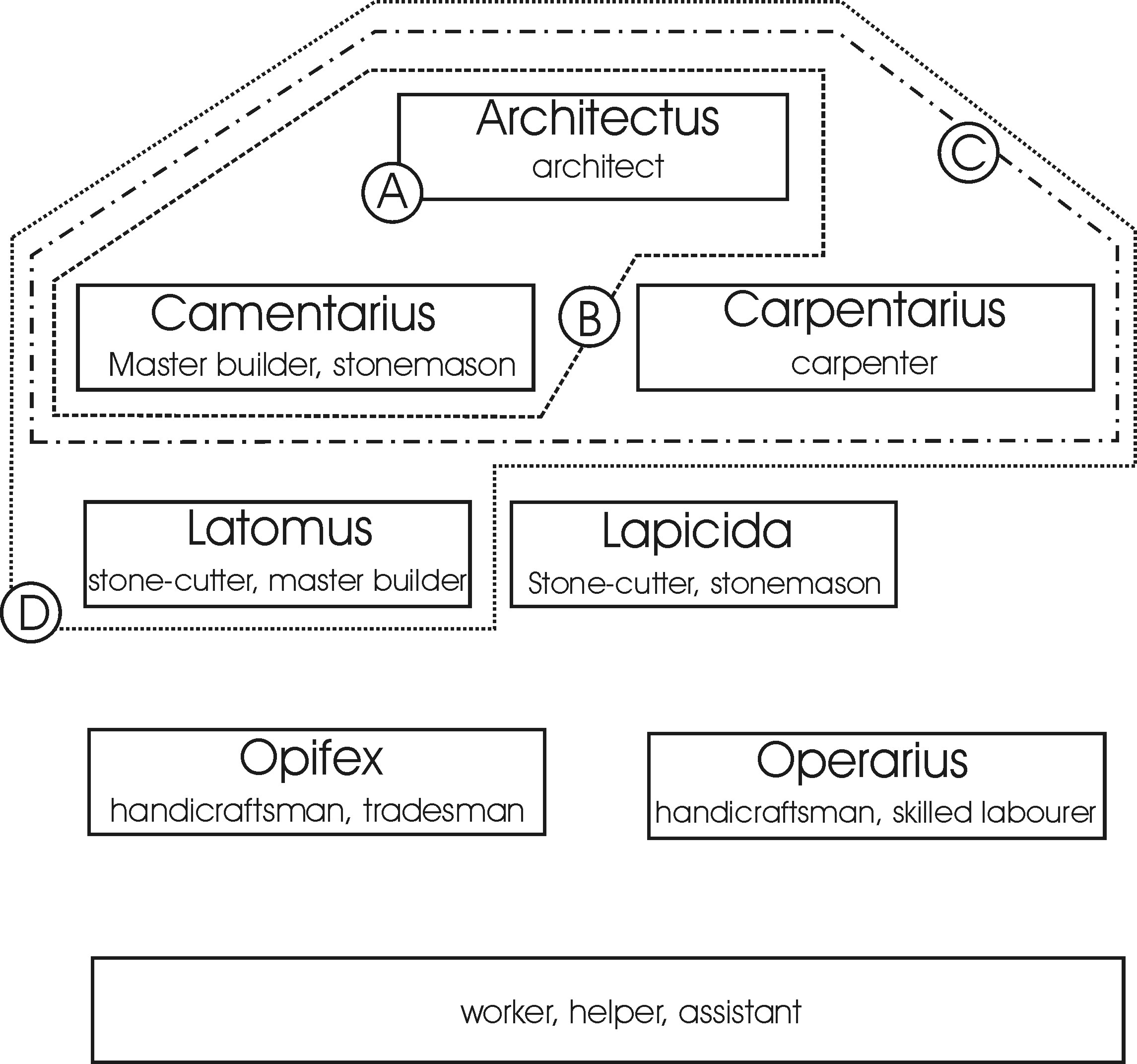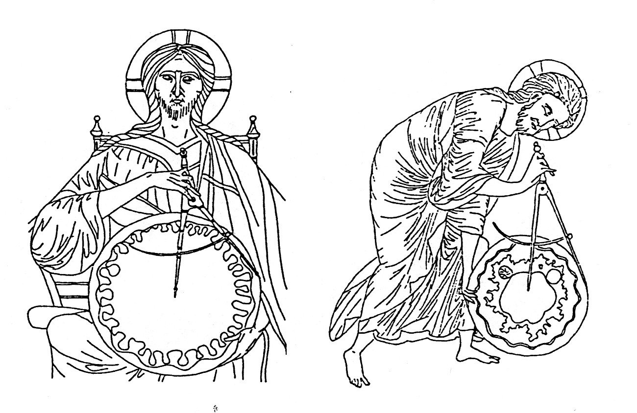 The compass takes an important position in this list of tools as an instrument for planning, drawing and measuring. Pantocrator is often pictured with a compass in his hand drawing the outline of the Earth (See Figure 9) (Binding 1993). The circle is the most perfect shape, and it is suppose to represent the exquisite completeness of Creation. In contrast with the well-documented tools, the division of the building work is less well known. Since the language of these documents is Latin, the interpretation and the concept can often get lost in the translation. The meanings of the words are often clarified only by the wider interpretation of the text (Jüttner 1935). The building work division and hierarchical structure is illustrated in Figure 10. The architect was not only the planer of the building, but he also actively participated in the building work. In case of smaller buildings he was also the master builder. The real function of the architect and the wider knowledge of his name depend on the size of the building work (See Figure 10) (Nemcsics 2010). At smaller building works the planer took an active part in the construction work. Reliefs, picturing foundation work, confirm that the planer and the builder are often the same person (Nemcsics 2010).