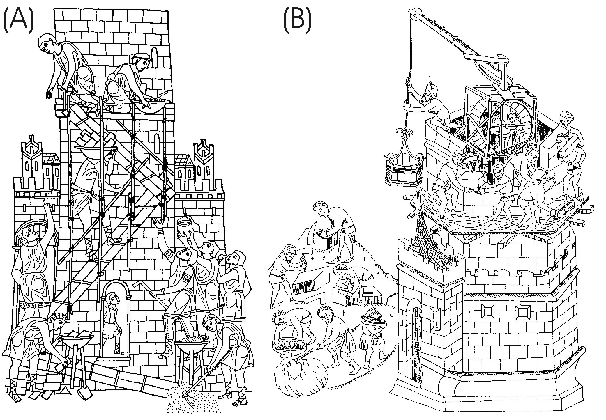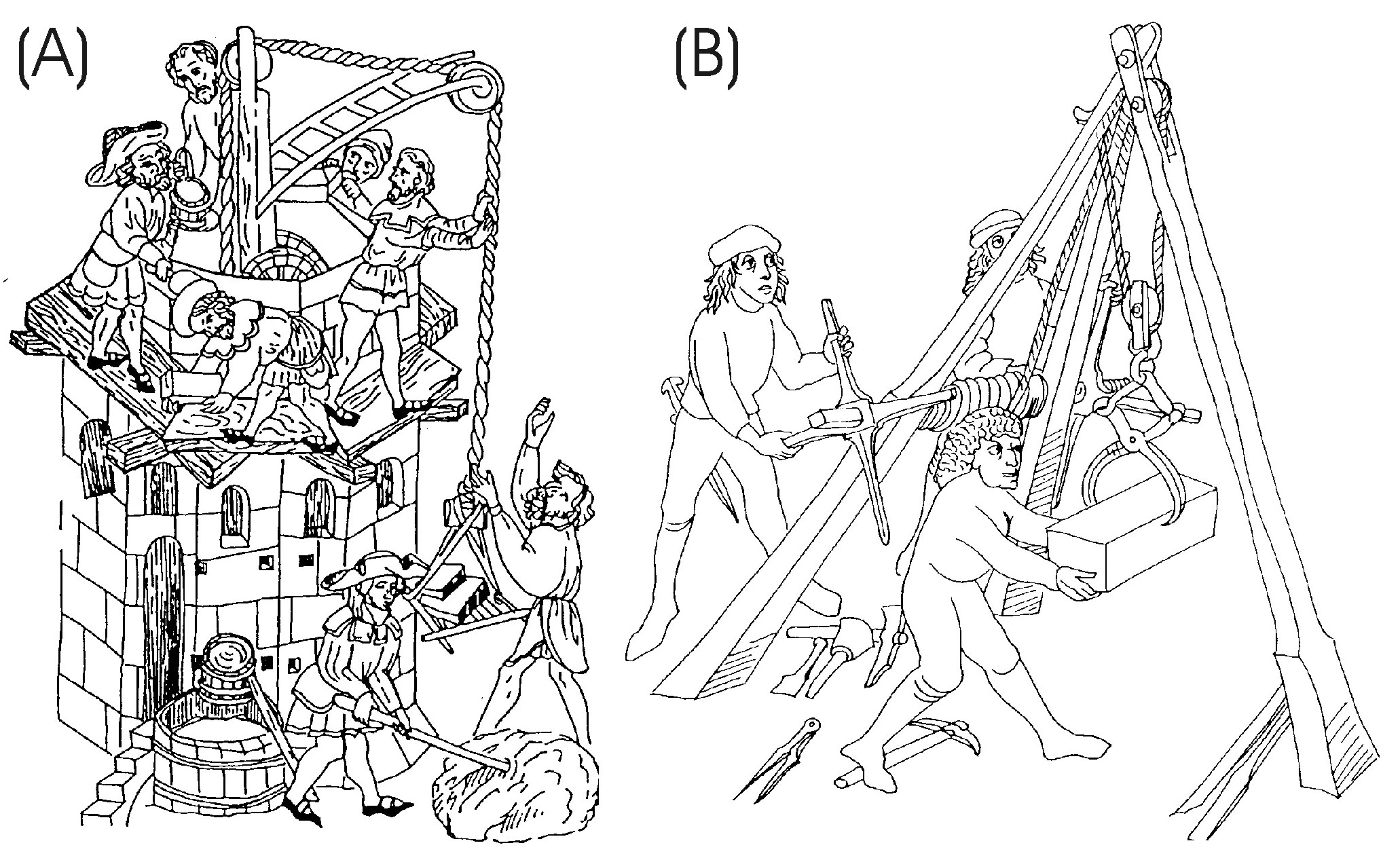 The console-based scaffolding is specifically geared to construction work using regular shaped cut stones (See Figure 11 A). Building construction of this kind is characterized by the interchange-ability of the stones and the use of stones specifically cut to size and hewn to fit the place. For building a specific part of the wall the builder only needs a few stones, cut to size to fit the purpose, therefore there is no need for large number of stones to be stored on the scaffolding. As a result the scaffolding can be simpler and lighter, because they are not loaded by the great weight of the stones. This scaffolding is known not only from the illustrations, we can also deduce their construction from the holes made for the scaffolding beams, found on the remains of walls. The supporting beams were blocked in to the rising wall. The boardwalks were laid on the horizontal beams sticking out from the wall. The excess lengths of the beams were cut off. These scaffolding holes can be seen at Velemer church (Valter 2005). Some of the miniatures show the work division as well. The master builder was assisted by helpers. The building material is carried up by the unskilled workforce on ramps or ladders, or hoisted up by pulleys fixed to the higher beams. The heavier stones were hoisted up using a winch, supported by a tripod (See Figure 11 B). The stonemasons work at ground level, where others mixing the mortar (See Figure 12, below in the Image Gallery) (Binding 1993). The work division is the same as today’s cooperative, un-mechanised building work.