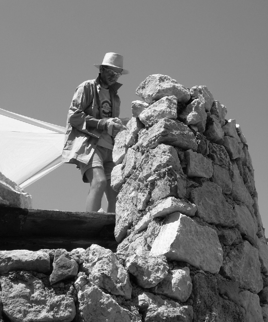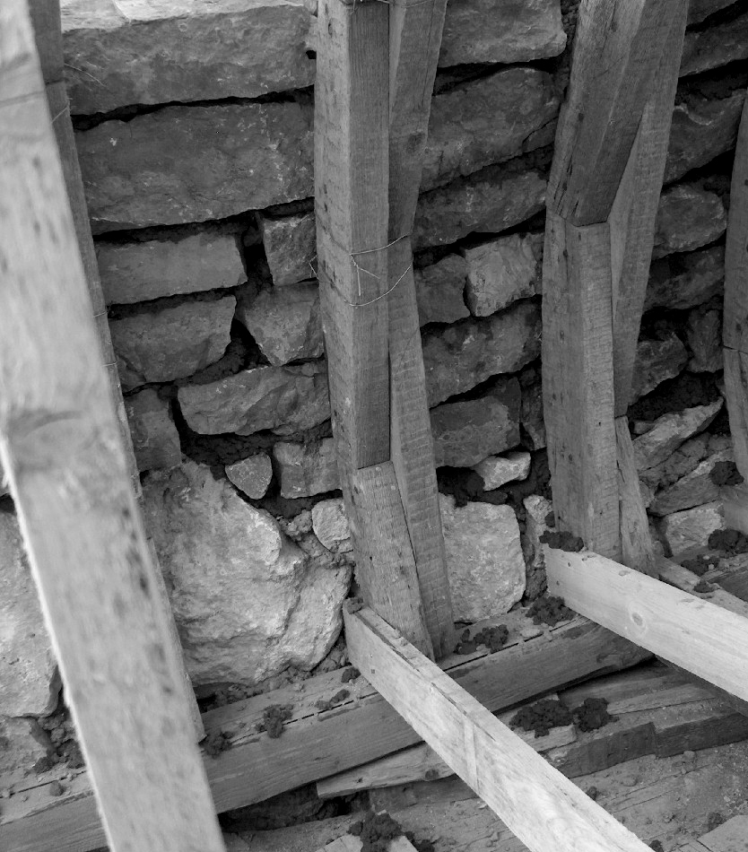 The local quarries, the same used for the original churches, supplied the building materials for the foundation and the walls. In the first year we completed the foundation of the church. The year after we carried on with the building of the wall. The stones were built in to the walls without any cutting (See Figure 13 a and b, below in the Image Gallery). The two mantels of the wall have been made of larger selected stones, and between them random selection of smaller stones filled the gap. The lower 1.5 m height could be built from the ground from either side of the wall. The use of the uncut stones goes with some “try and see” to find the right stone. For one particular place, a number of stones had to be tried in various orientations before one finally fit. We can conclude that one needs a large number of stones present for the process of selection. This determines the method of the scaffolding erection. In this instance the scaffolding portrayed on the miniatures showing the regular cut stone buildings is not applicable.