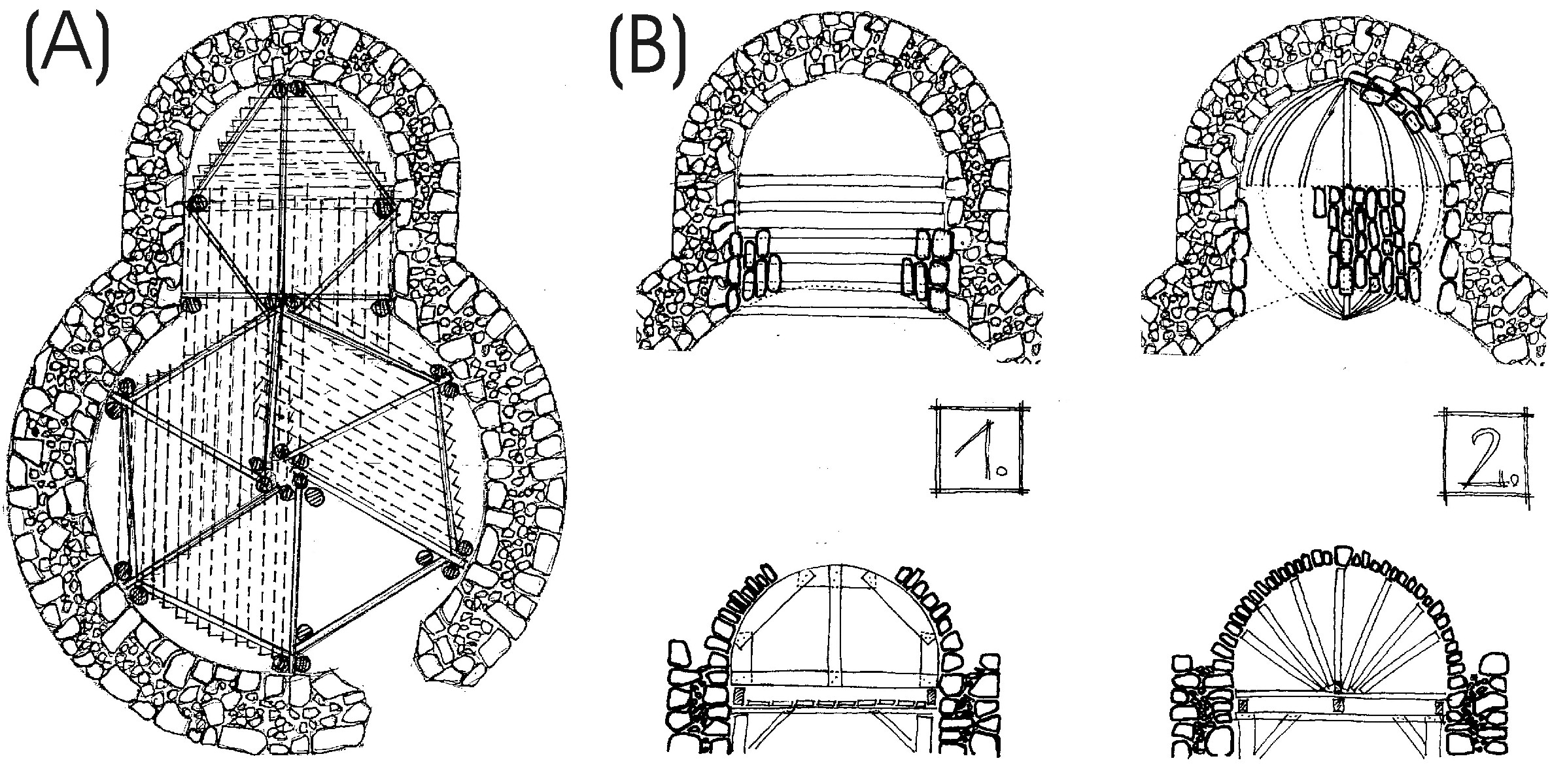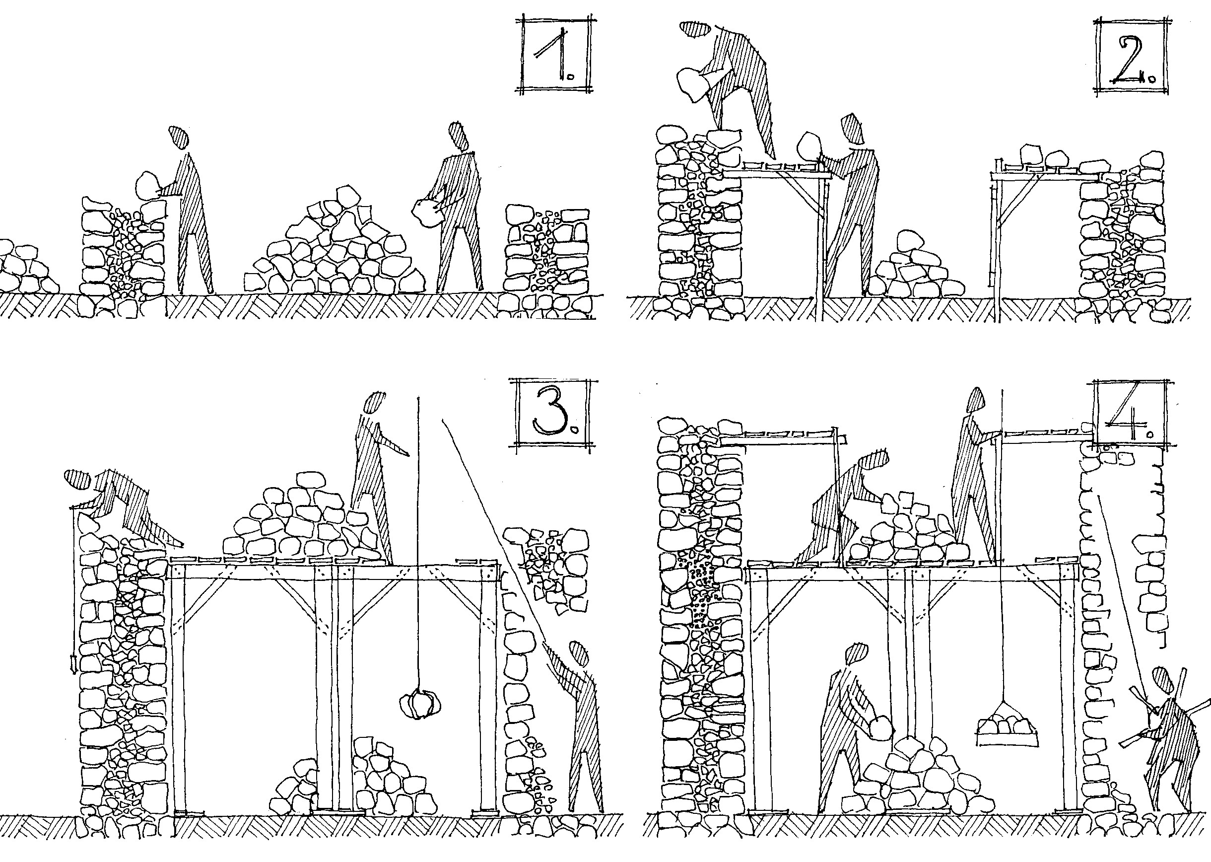 Fig 18. The process of building the vaulting of the nave. (1) Building the knee wall (half wall) from the stage (2) Building the vault from the stage. (3) Knee wall building from the mantle walls filled with stones. (4) Building the vault from the mantle walls (for details see the text).