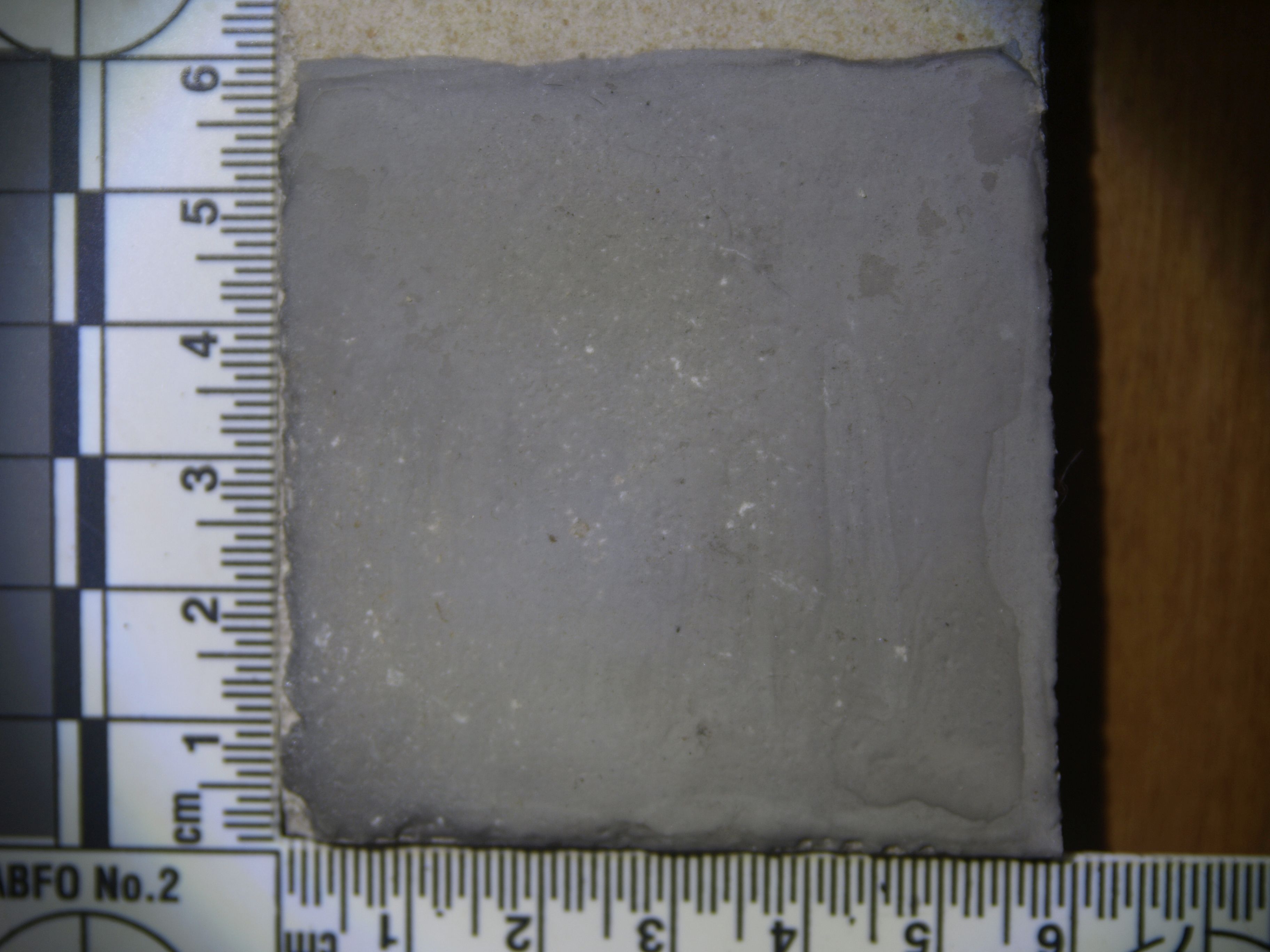 The glazed bisque plates did successfully capture ash. Unfortunately, likely due to a reducing atmosphere, the blue glaze came out grey which makes identifying the black and white ash more difficult (See Figure 6). Due to problems with the support arm the first plate worked the best with the impact of the chimney clearly visible across the entire plate. Counting the ash on this first plate produced a reading of 52.5 flakes per cm2 averaged over the 31.35 cm2 of the plate. Several pieces of ash appeared to be partially overlapping others. This suggests that exposing the plate for a shorter period (perhaps 60 or 90 seconds) would both provide additional readings, and also have lower levels of overlapped ash leading to a more accurate reading.