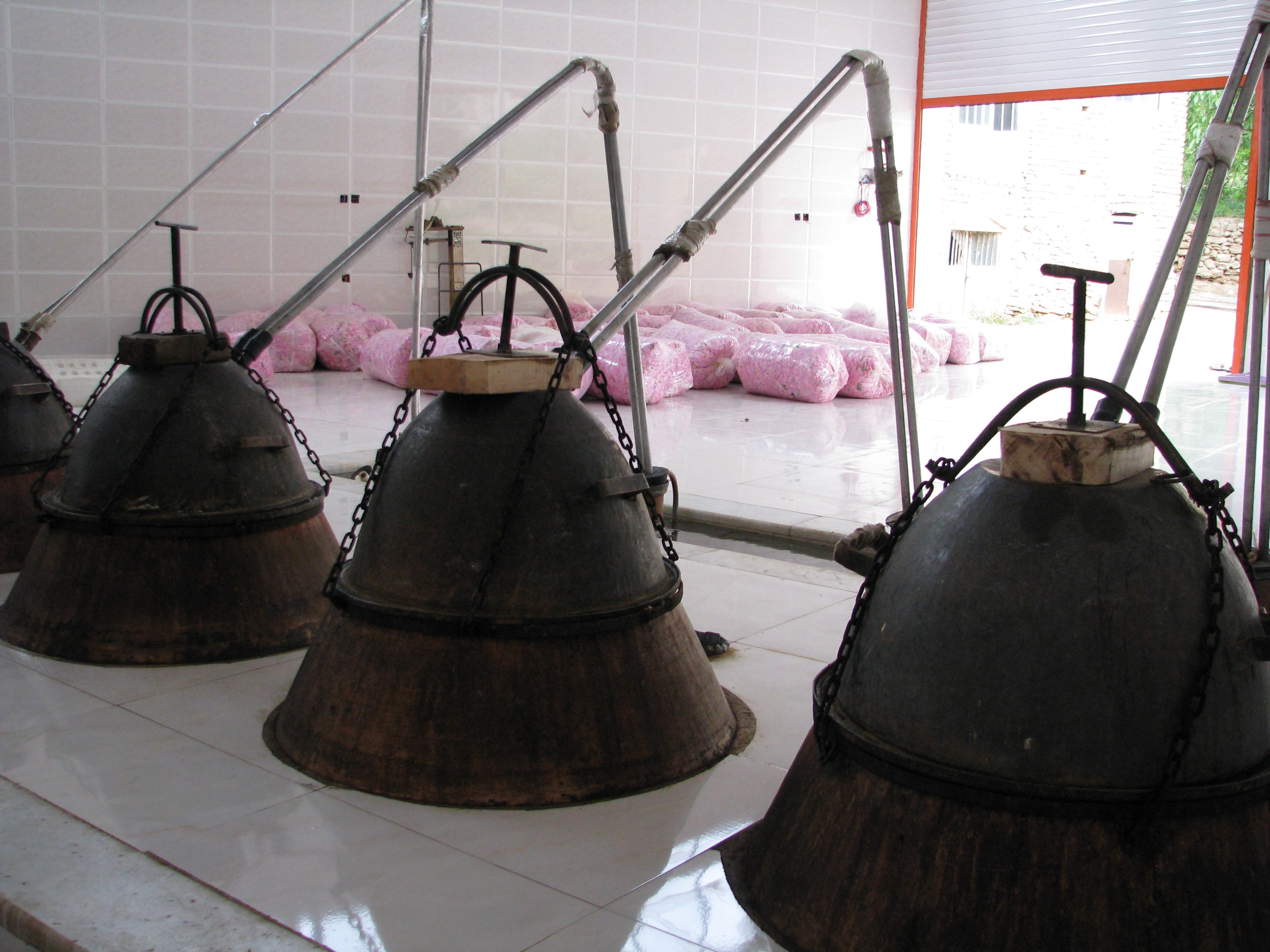Only the comparison with the Iranian tradition that still uses similar appliances to produce rose water and essential oil responds to Levey's assumption (1973 "Early Arabic Pharmacology”) that these devices were intended for the production of aromatic essences.
