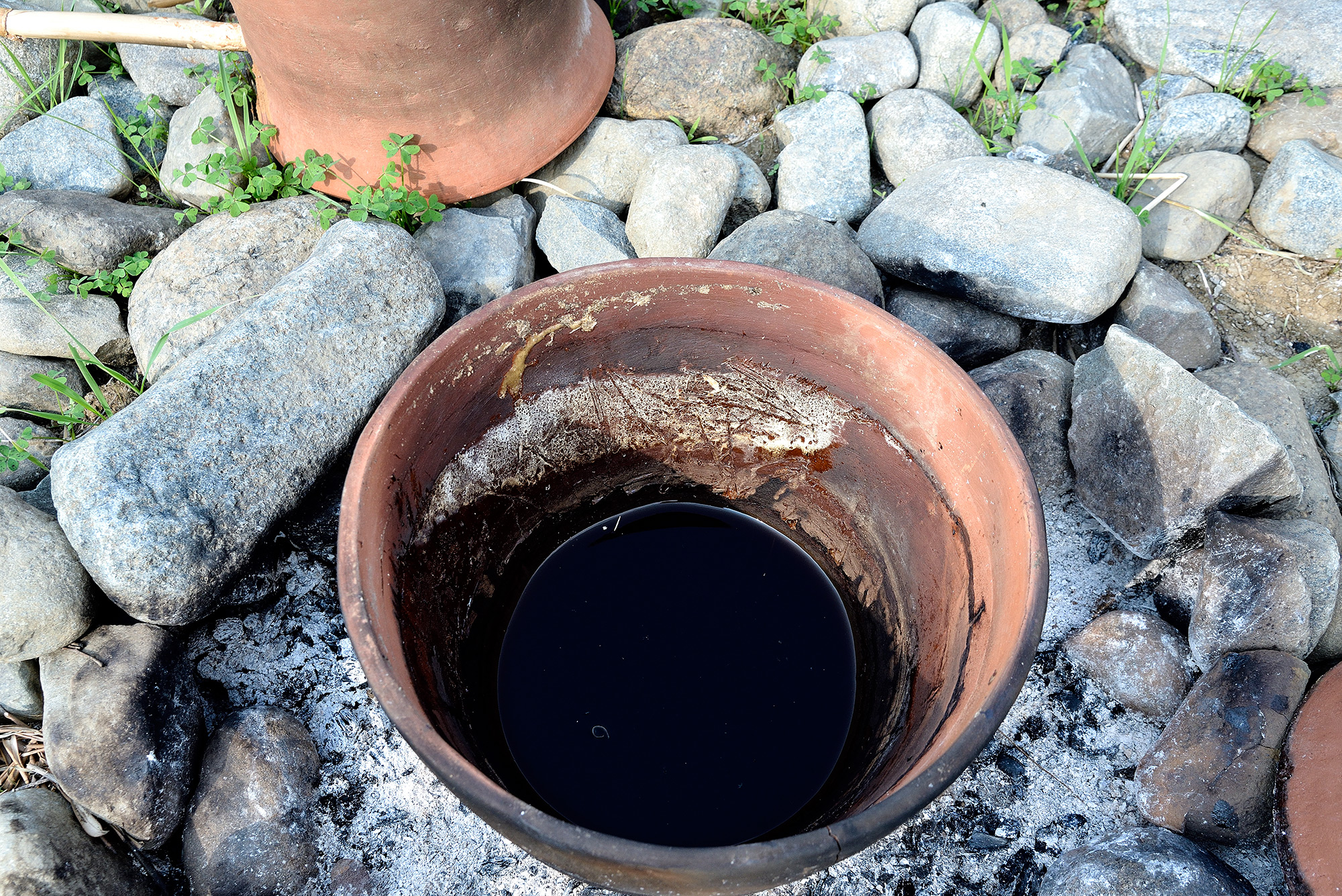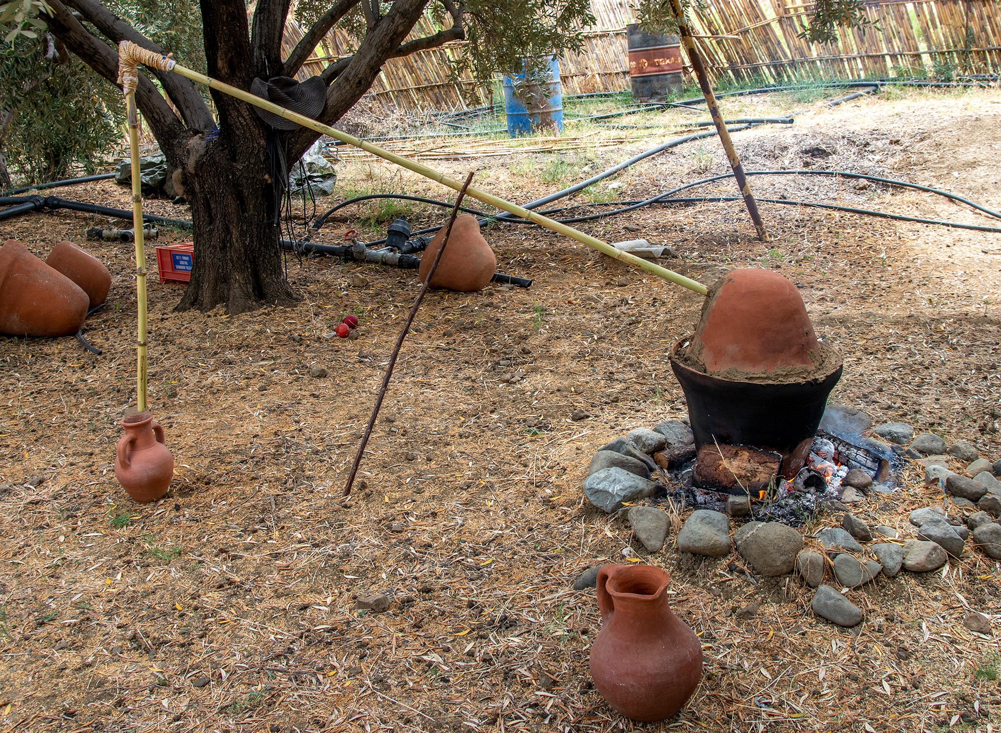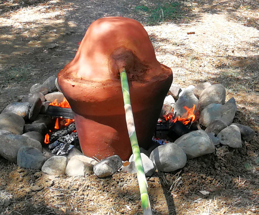 At the same time we were able to verify that a common Arundo donax rod can be used as a condenser to collect the liquid at a certain distance from the fire, and how it can be cooled by wrapping it in wet cloths to accelerate the condensation of the liquid. Direct experience has shown how important the distribution of fire around, and not under, the apparatus was - gradually increasing the heat without the risk of fractures of the ceramics, respecting the recommendations of the experts that neither alcoholic drinks nor essential oil exceed 100 degrees of temperature. The alcohol in fact vaporizes at 70 degrees and the essential oil is dispersed in the vapor after 100 degrees.