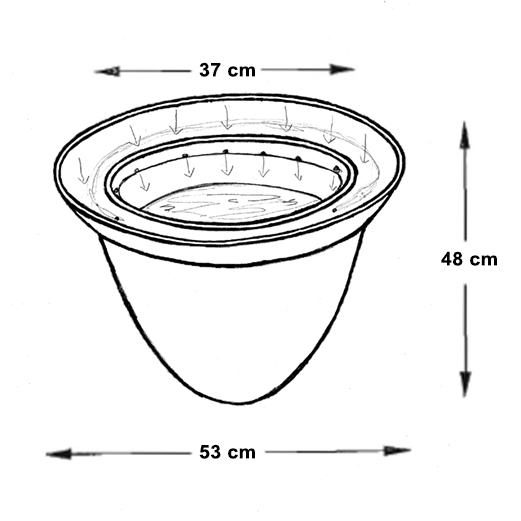 At Tepe Gawra, 12 examples of this jar were found at different levels. Four are complete and eight are fragmentary. M. Levey, who in 1950 studied the material in the University of Pennsylvania Museum of Art and Anthropology, connected these jars to some unusual strainers and funnels found together, and which were probably related to the rituals performed in the tripartite temple in the small village. This vessel type has a conical shape with a rounded base, it measures approximately 45-50 cm in height, and has a variable diameter of 39 and 50 cm. The channel around the mouth forms a ring of 8cm thick and of 10/12 cm depth, thus corresponding to a capacity of 2 litres while the pot itself can hold approximately 37/40 litres. It has a row of holes in the bottom, communicating with the inside of the vase (See Figure 6).