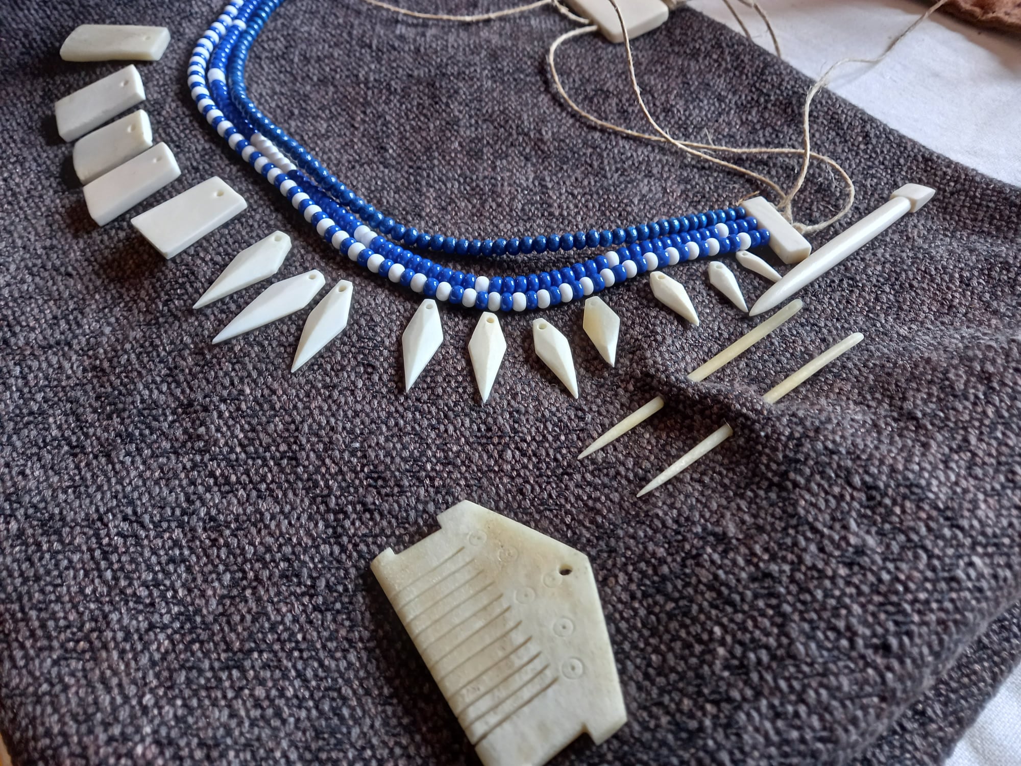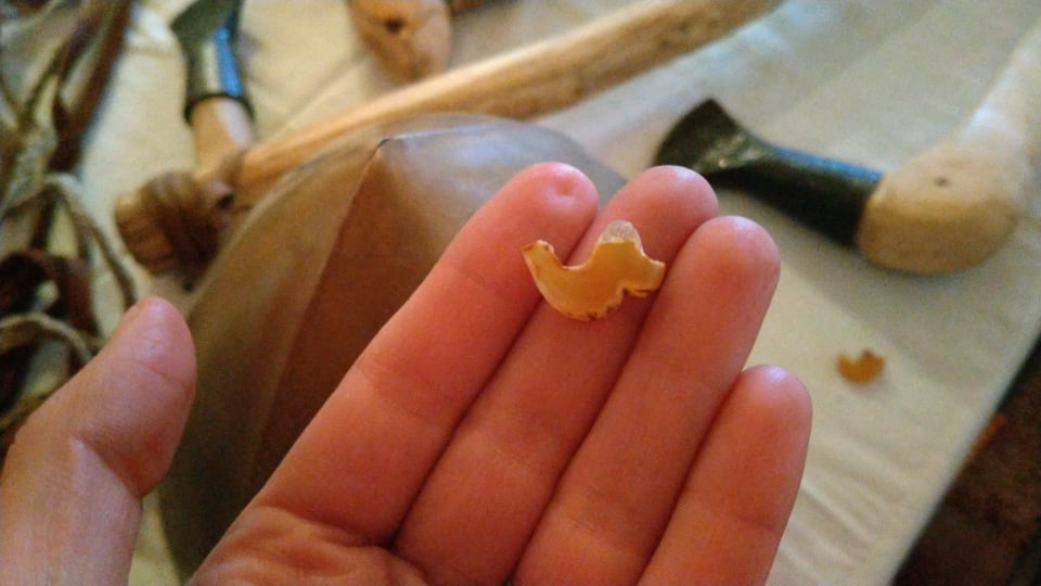 In the afternoon it was time for the indoor workshops: bone working and amber carving, and while me and Dr. Mattia Sbrancia, who was cooperating with Arte Picena, were occupied with files and hand drills, the other members of our groups were explaining to the public the wide range of replicas we were exhibiting at our educational banquets. Of course the interaction with these objects was most appreciated, especially by kids, and soon we had children wearing bronze helmets and wielding spears and short swords (made blunt for the occasion) pretending to be fierce Picenian warlords some 2700 years ago.