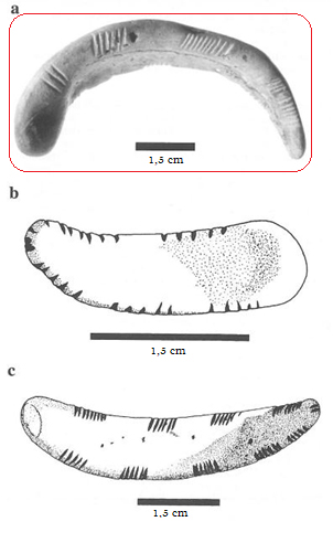 Among the Paleolithic ornaments are several Glycimeris sp. mollusc shells processed to obtain half-moons engraved with linear motifs. In 1999, three of these half-moons (See Figure 1) were analysed by M. Bisconti with the aim of reconstructing the operational chain related to their production: the hypothesis was that the half-moon was initially detached from the shell, producing the engravings in a second step which was followed by the polishing and the colouring of the object with red ochre (Bisconti, 1999, p.41).