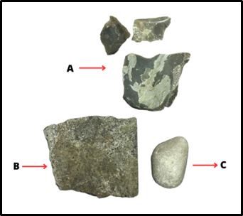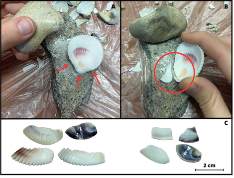 The experimentation was carried out using shells of Glycymeris sp. collected from the beaches of the Roman seacoast. A flint pebble, as a striker, and a stone anvil were used to detach the half-moon from the shell (See Figure 2, B-C). The incisions were made with flint chips, to which the active edge had to be sharpened during the experimentation (See Figure 2, A). Red ochre was used for colouring, which was inserted into the incisions with the aid of a wooden stick.