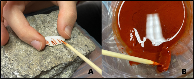 Step 3 - Colouring: after combining water with ochre powder, the resulting paste was applied in two ways: either by placing the ochre directly on the carvings with a wooden stick (See Figure 5), or by completely dipping the half-moon in the paste.