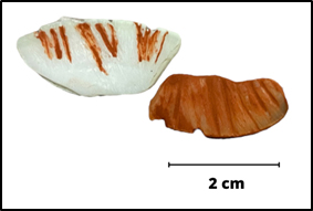 The work provides an initial moment of detaching the half-moon from the shell, in this case gradually breaking the surface with the use of a pebble as a striker and a stone percussion plane. Next, the valva was first smoothed and then engraved, inverting the operational chain proposed by Bisconti in 1999. (Bisconti 1999, p.41). Some difficulties were encountered at this stage: it was complicated to best direct the engravings and make them all fit into the same "track”, although for the people of the time, who probably had different manual abilities than ours, this problem might not have occurred. Finally, the grooves were filled with ochre using two different techniques: first, by directly inserting the colour into the lines; second, by completely covering the surface of the shells.