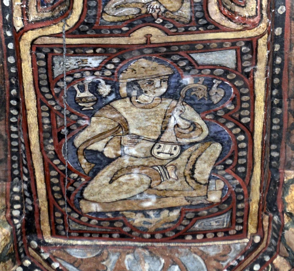 The central nave ceiling is in muqarnas (a particular construction typical of Arab architecture)The ceiling shows a series of scenes narrating stories from the Islamic narrative repertoire. Eight octagonal stars bear inscriptions in Kufic script, which are not Quranic verses but auspicious messages: strength, health, and power, likely directed at the Emir before King Roger. In all cases, the details are indistinguishable because the paintings are in dim light 18 meters from the observer on the ground. What appears is a large patch of vibrant colours in a dense texture reminiscent of a large carpet, requiring binoculars to observe the ceiling details and a telephoto lens to take photos from the ground. The musician figures, some of whom appear to be female, are mostly arranged in pairs. The characters face each other while playing different instruments: a large four-course lute/small three-course lute; large lute/three-string rabab; small lute/two-string rabāb. The instrument pairs are always in the following relationships: tenor/alto, alto/soprano. The musicians are surrounded by foliage and small vases (See Figure 1), sometimes seated at the base of a palm tree, in a crossed-legged or overlapping-leg posture (See Figure 2).