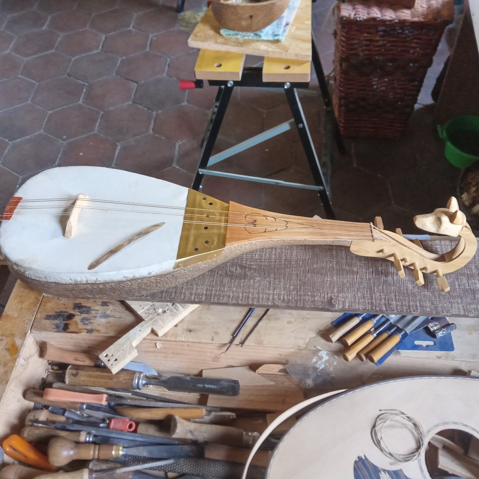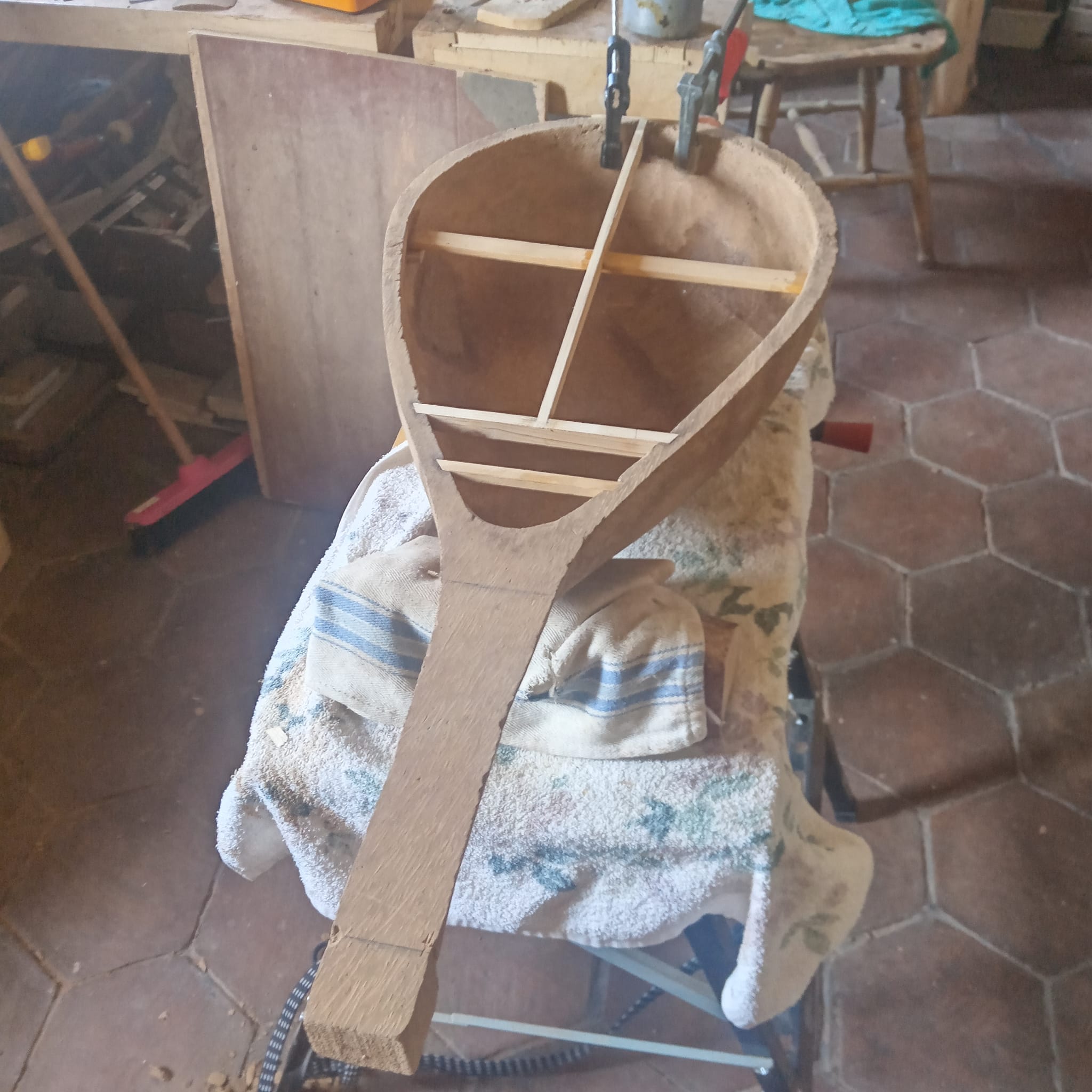 According to Paniagua (2018, pp.93-104) and Bouterse (1979) the large lute (ūd), with a ribbed body and a wooden soundboard, was introduced into the Arab world as early as the 9th-10th century. Previously the Persian barbat was carved in a solid block and had a skin or wooden top. Carving a large lute from a single block of wood is neither easy nor convenient. There is uncertainty about the choice of wood, the shape to give the body, the risk of cracks and splits, and the control of thicknesses. In the construction of current Moroccan loutars , lute-like instruments of considerable size , the body is carved from a single large piece of softwood, such as poplar or willow, with a width close to that of the ūd but certainly shallower. A rounded neck is then applied and held firmly in place by the robust leather glued and tied to the body. This is made more resistant with one or two transverse wooden bars glued inside. A carved lute has the robustness to withstand the tension of the leather soundboard, whereas a thin-ribbed instrument must necessarily have a wooden soundboard mounted and glued to the upper edges.