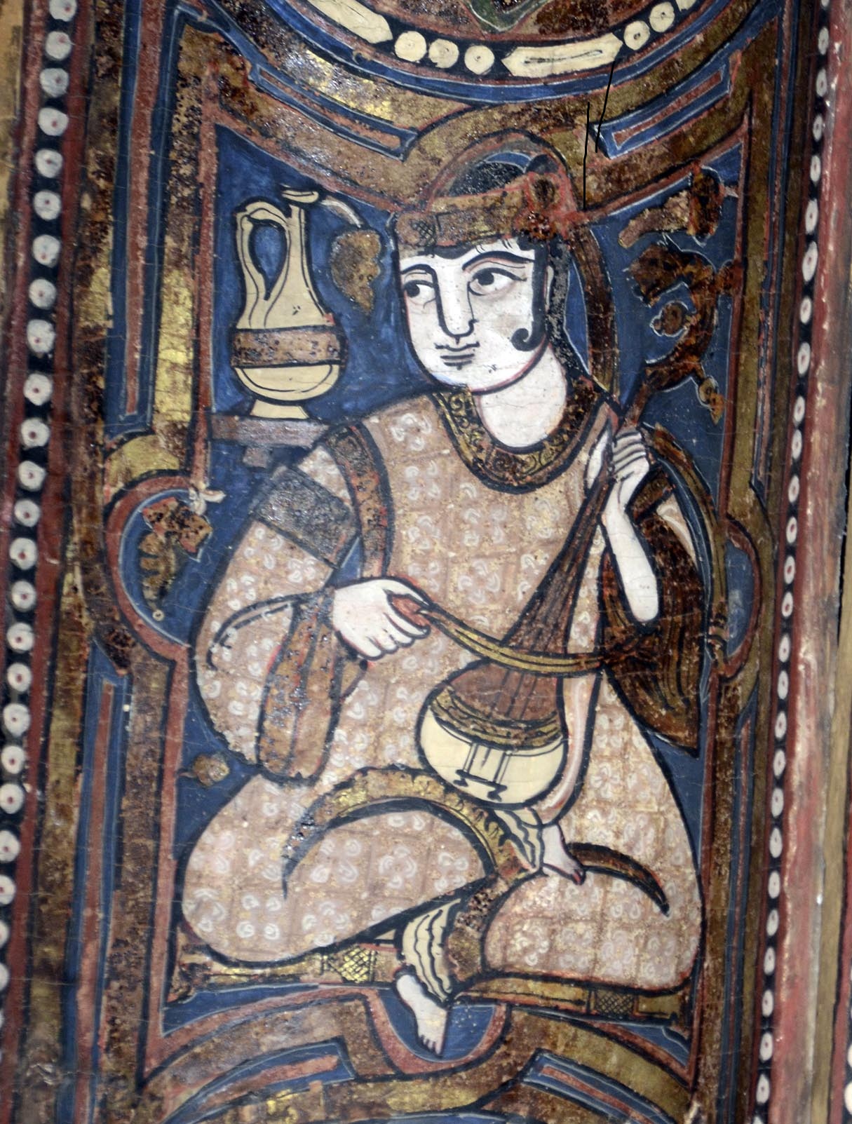 The side naves are covered by parallel beams defining long and narrow compartments. In the right nave, there is a rabāb player and, higher up, a lute player. On the left, there are three five-course lute players and three players of slightly different plucked string instruments. The decorative intent and tendency to imitate the central nave's style are clear, but there is no trace of an organized narrative in successive scenes. According to Guettat (2000, p. 67), five-course lutes came into use in the 13th century, with almost certainly wooden soundboards.
