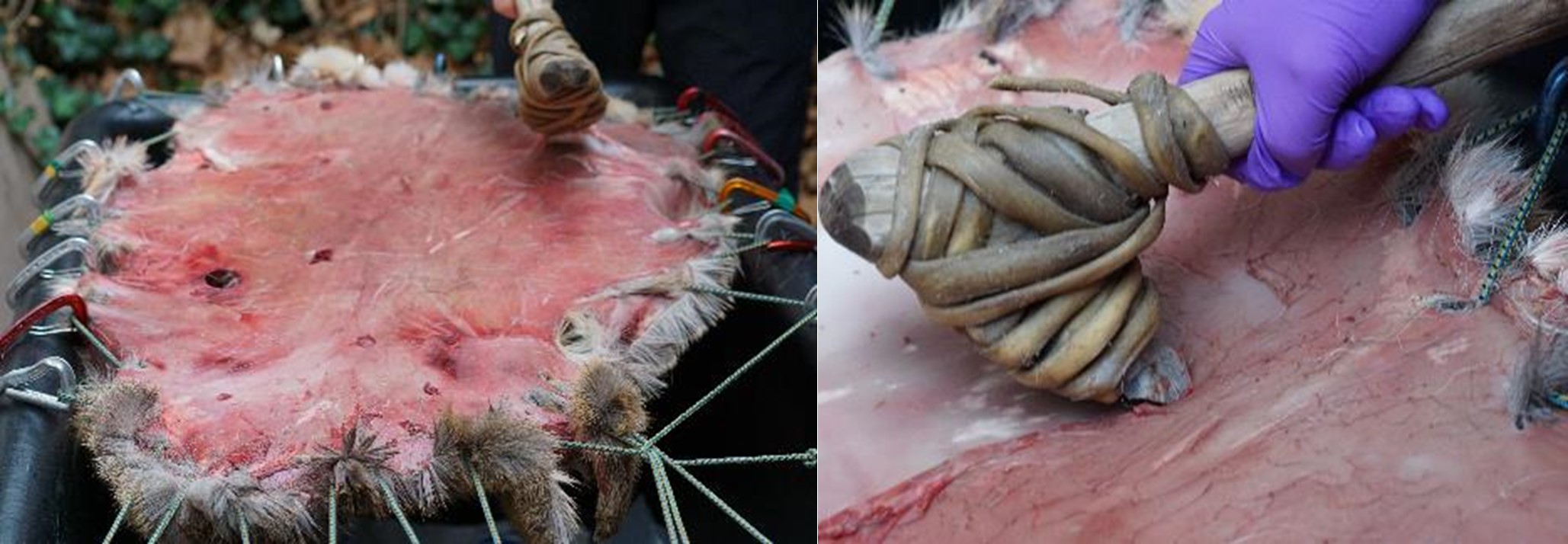 Rawhide bindings were manufactured from an untreated cow and red deer hide by CS. The hide had both the flesh and hair scraped off with steel tools and stone tools, with the use of an alkaline solution used to aid in hair removal. The hides were subsequently cleaned with a pressure washer (on low) to remove the alkaline (See Figure 6) Steel tools were again supplemented for stone tools for consistency and more familiarity with steel tools. There was no perceptible difference in the areas of hide worked with stone and steel tools.